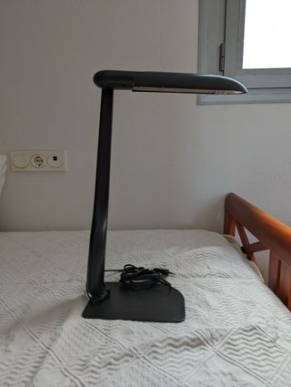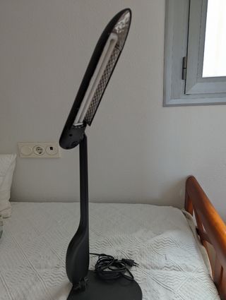 Lámpara de escritorio con un diseño moderno y flexible. - Cuello ajustable para dirigir la luz. - Base estable para colocar en cualquier superficie. - Cable de alimentación incluido.