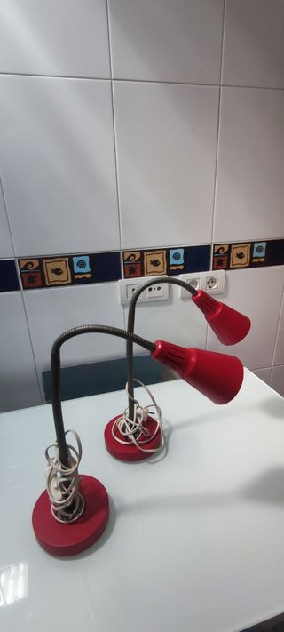 Dos lámparas flexos rojas con bombillas incluidas para escritorio o mesillas. De regalo lámpara de techo 72cm a juego con tres bombillas incluidas E14