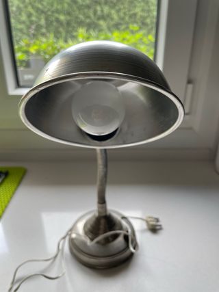 Lámpara de escritorio en buen estado. Es de color plateado y está fabricada en metal y plástico. - Diseño flexible y articulado. - Base estable y robusta. - Ideal para iluminar tu espacio de trabajo.