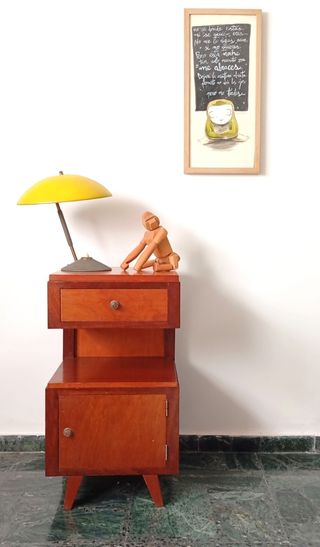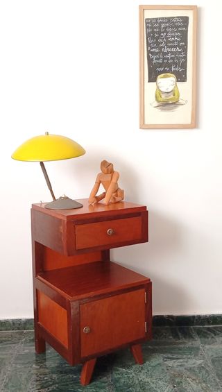 Original mueble de los años 30- 40 de origen francés, con un diseño funcional y elegante. Realizado en madera con un cajón superior y un pequeño.armario.en la parte inferior. Perfecto como mesita o mueble auxiliar. En muy buen estado (sin roturas ni carcoma), perfecto para dar un toque vintage a cualquier decoración. Medidas: Alto 64,5 cm Ancho 37 cm Fondo 33 cm Midcentury Francia