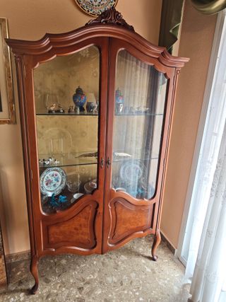 Se vende vitrina de madera de estilo clásico (Luis XV), en muy buen estado de conservación. Puertas acristaladas curvas, baldas de cristal y patas cabriolé. Mueble elegante y sólido, ideal para salón o comedor. 🔹 Material: madera 🔹 Estilo: clásico francés 🔹 Baldas interiores de cristal 🔹 Cristales originales en perfecto estado 🔹 Medidas aprox.: 190 cm alto × 120 cm ancho × 45 cm fondo Mueble cuidado, sin golpes importantes ni desperfectos visibles. Por tamaño y peso, recogida en mano.