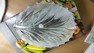 Bandeja de cristal grueso decorada. En perfecto estado. Para múltiples usos (como vaciabolsillos, para velas, como frutero...) Medidas aproximadas: 26 cm largo x 15 cm ancho