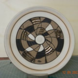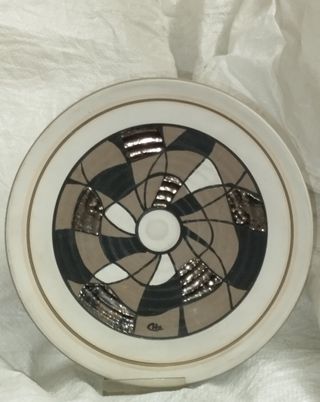 Plato decorado a mano en blanco, marrones y cremas. Dependiendo de la luz que incide sobre él cambian los matices de los colores y los brillos. Se puede utilizar como centro de mesa, frutero o decorando una pared o un aparador. La firma del artesano se encuentra en la parte trasera del plato. Tiene un diámetro de 24 cm. y la altura aproximada son 4.5 cm