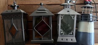 Conjunto de cuatro piezas decorativas, incluyendo candiles tipo vidriera y un faro. - Candil negro con detalles calados y cristal ámbar. - Candil gris con cristales de colores (rojo y amarillo). - Candil plateado con detalles ornamentales y estrella. - Faro decorativo con base bicolor (blanco y azul). Solo envíos.