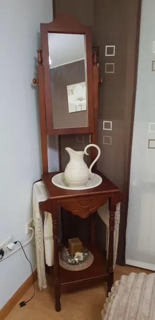 Mueble palancanero con espejo basculante y dos estantes. - Estructura de madera. - Espejo con marco de madera. - Estante superior con bandeja y jarra. - Estante inferior con vela decorativa.