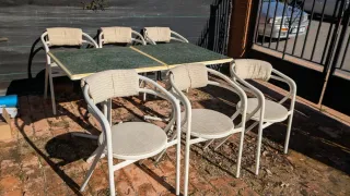 Juego de 6 sillas y dos mesas de bar