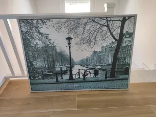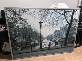 Fotografía urbana de Ámsterdam con un toque de color. - Marco de metal y madera. - Imagen en tonos grises con detalles en rojo.