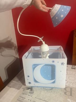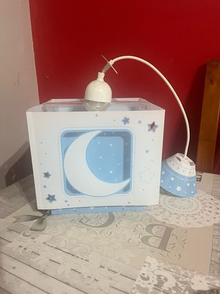 Lámpara infantil con un diseño de luna y estrellas. Ideal para la habitación de los más pequeños. - Forma de caja con ventana. - Decoración de luna y estrellas. - Colores blanco y azul Efecto fluorescente: Los detalles de luna y estrellas suelen contener tinta fluorescente que brilla en la oscuridad después de estar expuestos a la luz durante unos minutos, creando un ambiente agradable y mágico en la habitación.