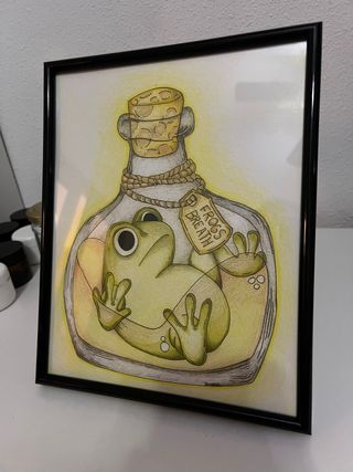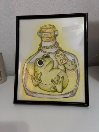 Cuadro decorativo con un diseño único de una rana dentro de una botella.
