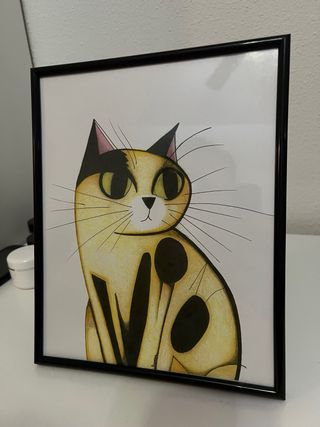 Este cuadro decorativo presenta un diseño de gato. - Marco negro. - Ilustración en tonos amarillos y negros.