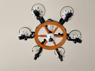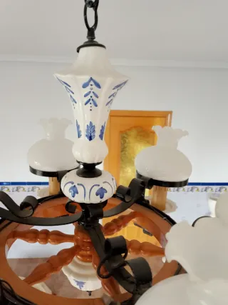 Elegante lámpara de techo con un diseño único que combina forja y detalles de porcelana. - Estructura de metal con un acabado en madera. - Seis brazos con tulipas de cristal. - Adornos de porcelana con diseño azul. Venta en persona Negociable
