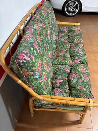 Sofá de bambú con cojines florales