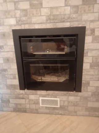 Chimenea de diseño moderno con acabados en negro. - Marco exterior metálico. - Puertas de cristal para visualización. - Rejilla inferior de ventilación.