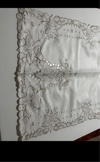 Por cierre de tienda, se vende Elegante mantel de algodón con un diseño floral bordado y detalles de puntilla. Tiene 12 servilletas de algodón a juego. - Ideal para 12 comensales. - Acabado en tonos beige y blanco. - Confeccionado en tejido de alta calidad. Medidas: ancho 180cm por 270cm de ancho