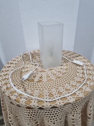 Lámpara de mesa con un diseño moderno y elegante. Su forma cúbica y acabado translúcido la hacen un elemento decorativo. - Material: Vidrio y tela. - Color: Beige y blanco.