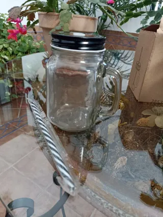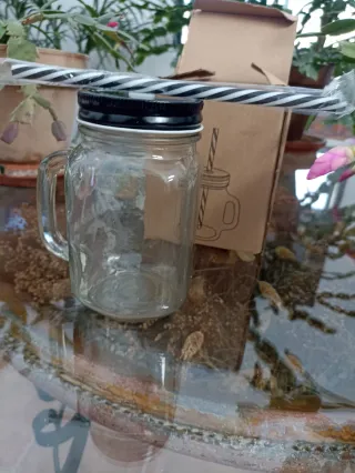 Vaso de cristal con tapa negra y pajita a rayas. Ideal para bebidas. - Material: Vidrio y pajitas de plástico duro. - Color: Transparente y negro.