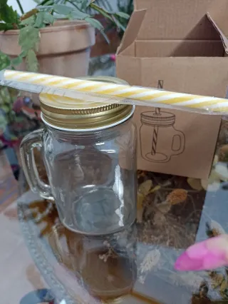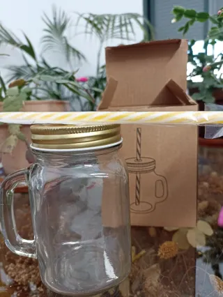 Vaso de cristal con un diseño clásico y una tapa metálica dorada y una pajita a rayas. Ideal para bebidas. - Asa para un agarre cómodo. - Tapa con rosca para un cierre seguro.