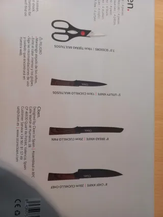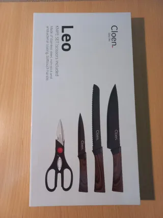 Set de cuchillos y tijeras de cocina de la marca Cloen, modelo Leo. El set está sin abrir. - Cuchillos fabricados en acero inoxidable. - Recubrimiento antiadherente y antibacteriano. - Mangos con tacto suave.