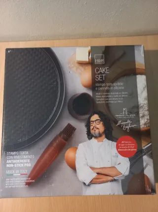 Set de repostería que incluye un molde para tarta desmontable y un cepillo de silicona. - Molde redondo de metal. - Cepillo de silicona con mango.