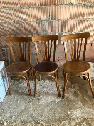 Conjunto de tres sillas de comedor con un diseño clásico y elegante. - Fabricadas en madera resistente. - Asientos redondos y respaldo con varillas. - Perfectas para cualquier comedor o cocina.
