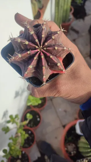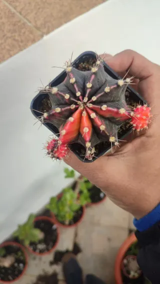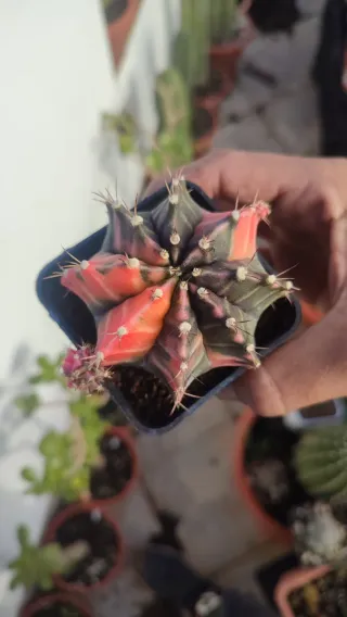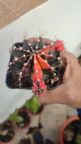 Planta de cactus Gymnocalycium variegado con tonos vibrantes. - Cactus con variegación. - Colores rojos y grises. - Espinas blancas.