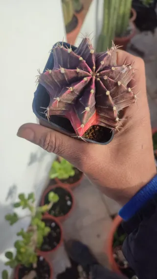 Planta de cactus Gymnocalycium variegado con tonos morados y rosados. - Cactus con variegación. - Maceta negra incluida.