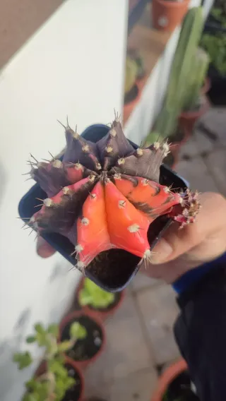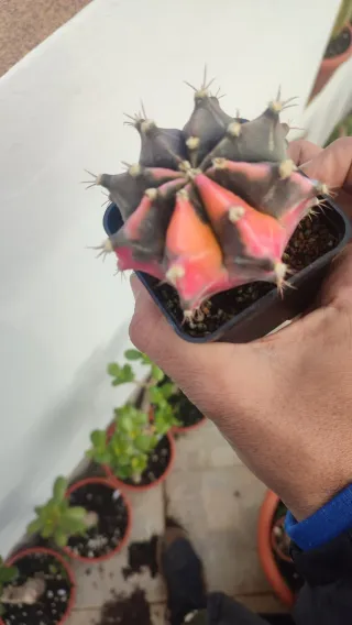 Planta de cactus Gymnocalycium variegado con colores vibrantes. - Cactus con variegación en tonos naranjas, rosas y morados. - Espinas blancas y finas. - Planta injertada.