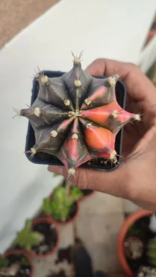 Planta de cactus Gymnocalycium variegado con colores vibrantes. - Cactus con variegación en tonos rosas y verdes. - Espinas finas y blancas. - Ideal para coleccionistas.