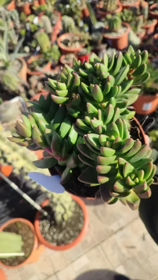 Planta suculenta Crassula Benn. - Hojas carnosas y apiladas. - Tonos verdes y rojizos en los bordes.