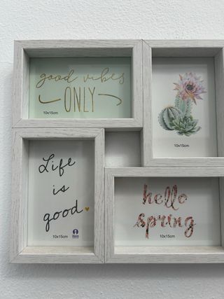 Marco de fotos con varios compartimentos para tus recuerdos. Presenta un diseño moderno y elegante. - Marco de madera con acabado envejecido. - Incluye 6 espacios para fotos de diferentes tamaños. - Diseños inspiradores en algunas de las fotos incluidas.