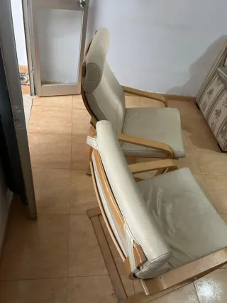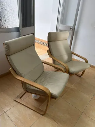 Conjunto de dos sillas de diseño moderno y confortable. - Estructura de madera curvada. - Asiento y respaldo tapizados en cuero. - Color beige y detalles en madera natural.