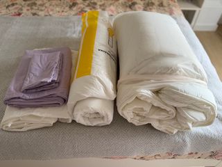 Pack de ropa de cama de IKEA para cama 160x200cm de matrimonio (colchón también a la venta en otra publi). • Protector de colchón impermeable • 2 sábanas bajeras blancas • Funda nórdica gris-verde + 2 fundas de almohada • Funda nórdica blanca (algodón + poliéster) • 2 almohadas altas (50x60 cm) • 2 almohadas ergonómicas (para dormir de lado/espalda) • 2 almohadas grandes (40x75 cm) 👉 Todo en buen estado. 👉 Ideal para equipar una cama completa