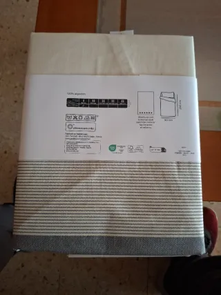 Juego de funda nórdica y fundas de almohada con un diseño a rayas en tonos neutros. Ideal para camas de 135 cm. - 1 Funda nórdica de 225 x 225 cm. - 2 Fundas de almohada de 45 x 80 cm. - Fabricado con poliéster reciclado. - Se añade también Sábana Bajera. - Vendo por error en medidas nueva cama. Nunca se ha usado. - Muy buena calidad.