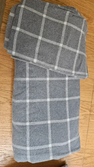 Funda nórdica afelpada de Zara, con un diseño a cuadros en tonos grises y blancos. Incluye 2 fundas de almohada de 50x75cm, una con signos de uso (última foto). De ahí el precio.