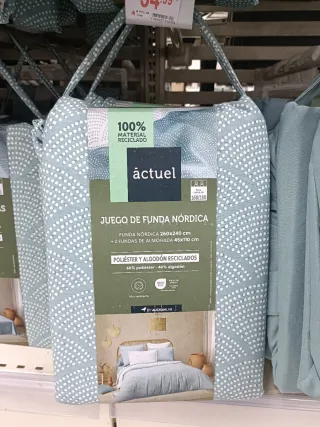 Juego de funda nórdica de la marca Áctuel, fabricado con materiales reciclados. Tela fresca para verano. - Funda nórdica: 260x240 cm. - Incluye 2 fundas de almohada: 45x110 cm. - Composición: 60% poliéster reciclado, 40% algodón reciclado. - Diseño con puntos blancos sobre fondo verde. Compré el verano pasado por 35€ Alcampo, está como nuevo, vendo x mudanza. Hago envíos, o recogida en mano por CC diagonal mar o Badalona