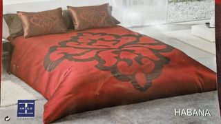Funda Nórdica de tejido jácquar para cama de 150 de Antilo. Sin usar, a estrenar, restos de tienda. Su precio era 174'80. Tiene algún pequeño desperfecto en el tejido. Color rojo y chocolate. Trae bajera y funda de almohada en marrón chocolate y 2 cuadrantes Medidas: Funda Nórdica: 240 x 240 cm Bajera: 150/160 x 190/200 cm Funda de almohada: 170 x 45 cm Cuadrantes: 60 x 40 cm