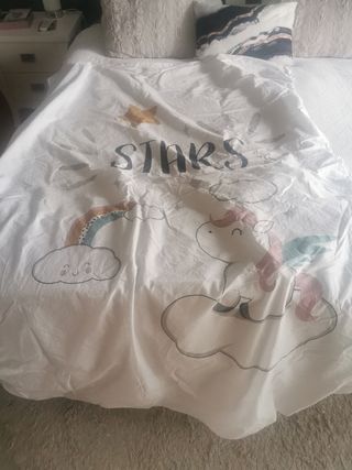 Nórdicos de unicornio, color blanco, reversible blanco y puntos negros. Cada uno 10 euros.. Apenas están usados Son dos. Nórdico grande cama 150, 160 x 200 metros. Blanco y con bolas alrededor. 15 euros