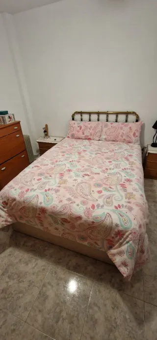 Funda rosa clarito, queda muy elegante.. La compre más grande de 1.35 para poder entallarla bien para la cama de 90 cm. Con dos almohadas a juego. Una sin estrenar.