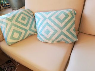 3Fundas de asientos y 2 respaldos para sofá diseño nórdico en blanco crudo y turquesa, y una más grande para chaise-longue,