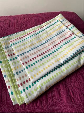 Conjunto funda nórdica cama 80/90 - Conjunto de ropa de cama para cama individual (80/90 cm). Es de Ikea y está descatalogado. Incluye: - Funda nórdica - Funda de almohada a juego. - 2 fundas de cojín de regalo En muy buen estado, ideal para dar un toque alegre y colorido a cualquier habitación.