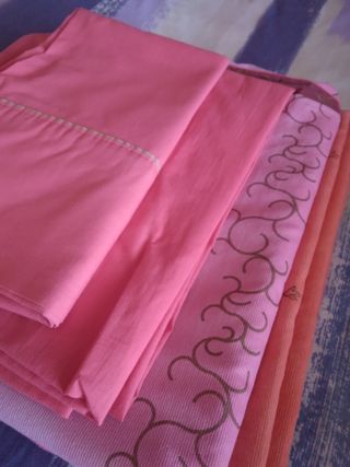 Juego de ropa de cama. Para camas de 1,35x1,90 Varios artículos. Estado: COMO SI FUERAN NUEVOS • 4 bajeras • 2 encimeras (1 de verano y 1 de invierno) con las fundas de almohada de la de invierno • 2 fundas de colchón (solo tengo foto de 1 de ellas) • 1 funda para nórdico