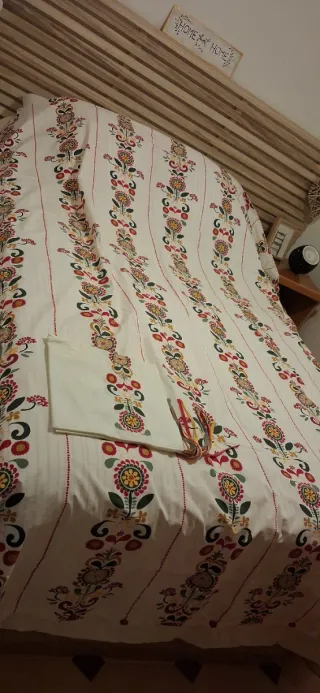 Juego de funda nórdica y fundas de almohada con un bonito estampado floral. - Funda nórdica para cama de 135 cm. - Incluye 2 fundas de almohada. - Tejido de algodón con 200 hilos. - Medidas funda nórdica: 240 x 220 cm. - Medidas fundas almohada: 45 x 110 cm. Además sabana bajera del Carrefur a juego y también de 135 cm.