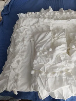 Funda nórdica para cama de 150 cm con un suave tacto melocotón. 2 fundas de almohada 75cm con volante y madroños a juego con la funda. - Diseño blanco con volante y madroños en blanco - Acabado con volantes. Cremallera en la zona para meter el relleno. Sin estrenar. En mi perfil tengo varias. Sí compras 2: 22,50€ Medidas200x230