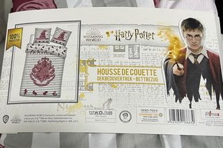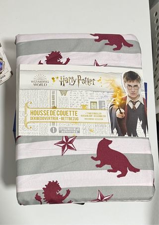 Conjunto de funda nórdica y funda de almohada con temática de Harry Potter. A ESTRENAR. El diseño presenta los animales representativos de las casas de Hogwarts. En la funda de almohada, el sombrero seleccionador. El precio original aparece en las imágenes, 29.95 - Medidas: 140x200 cm (funda nórdica), 63x63 cm (funda de almohada).