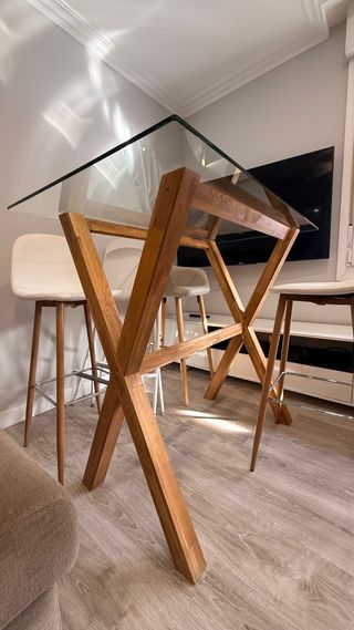 Elegante mesa con sobre de cristal y base de madera con un diseño en forma de X. - Base de madera maciza. - Sobre de cristal templado.