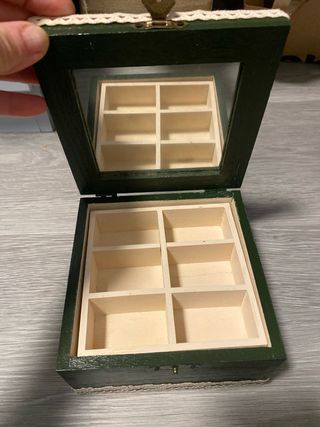 Caja de madera con un diseño único y artesanal. - Decoración de retazos de tela con motivos florales. - Figura decorativa de una muñeca en la tapa. - Detalles de flores y puntos en relieve.