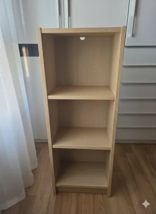 Estantería de madera clara con tres espacios de almacenamiento. Es un mueble práctico y versátil. - Diseño sencillo y funcional. - Acabado en tono madera natural.