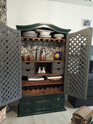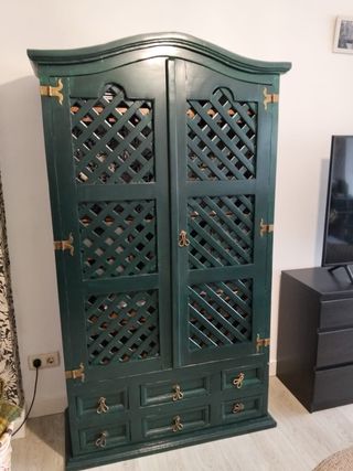 Armario de madera con un diseño único y elegante, que combina a la perfección con cualquier estilo de decoración. - Puertas con celosía. - Tiradores dorados. - Cajones inferiores. Mas, mesa baja, sinfonier y cajonera. Se aceptan ofertas ***