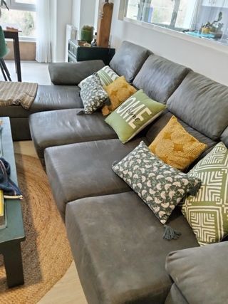 Sofá modular de gran tamaño, perfecto para salones amplios. Combina un diseño moderno con la comodidad. - Tapicería en tonos grises y detalles en verde. - Estructura robusta y asientos confortables. - Incluye varios cojines decorativos.