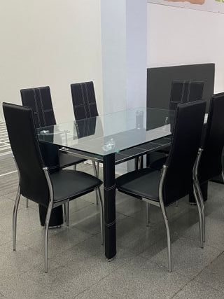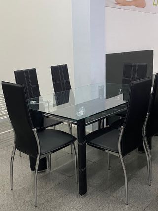 Conjunto de mesa de comedor con seis sillas. - Mesa con superficie de cristal. - Sillas tapizadas en polipiel negro HACEMOS ENVÍOS +INFO LLAMA O ESCRIBENOS +34 600473941 ✅Producto nuevo ✅Paga en casa